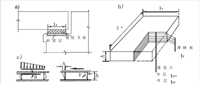 板式橡膠支座的構造Z為簡單,從外形上看它就是一塊放置在上下部結構之間的矩形黑色橡膠板,如圖 a 和 b 所示。它的工作原理是:利用橡膠的不均勻彈性壓縮實現(xiàn)轉角θ,利用其剪切變形實現(xiàn)水平位移Δ,如圖 c 所示。板式橡膠支座一般無固定支座與活動支座之區(qū)別, 所有縱向水平力由各個支座按抗推剛度大小進行分配。 必要時也可采用高度不同的橡膠板來調節(jié)各支座傳遞的水平力和位移。